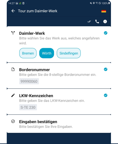 Mit der Bordero-Nummer beim Tourstart anmelden – das ist alles, was ein Fahrer auf dem Weg zu Daimler mit HABBL noch organisieren muss. Für den Rest haben die Daimler-Logistik, Inform und HABBL einen Prozess nach den VDA-Empfehlungen 4945 und 4996 entwickelt, der im Hintergrund automatisch abläuft. Dabei sendet die HABBL App aus dem Fahrzeug alle 15 Minuten die aktuelle GPS-Position und die voraussichtliche Ankunftszeit (ETA) des Lkw am Werkstor.